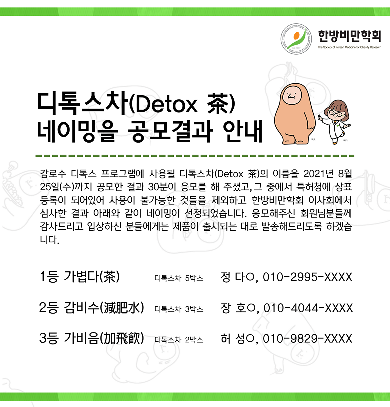 디톡스차(茶) 네이밍 공모 결과 안내 페이지 정보 작성자 관리자 댓글 0건 조회 3,168회 작성일 21-08-30 10:56 본문 목록 이전글네이버에 한방비만학회 이모티콘이 등록되었습니다. 21.09.14 다음글한방비만학회지 게재 논문 철회 공지 21.08.24 댓글목록 댓글목록 등록된 댓글이 없습니다.